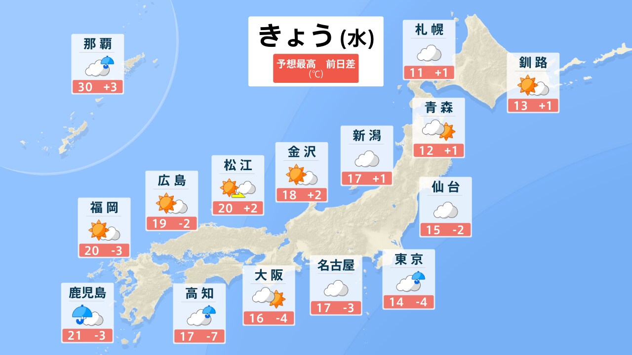 お天気ガイド 全国 10月22日(水)の天気 きょう あす ▼「各地のピンポイント天気」より検索してください▼ (※市区町村を選択するとより詳細なお天気情報を確認できます) 地域から選ぶ 北海道・東北 関東 中部・甲信越 近畿 中国・四国 九州・沖縄 都道府県から選ぶ 北海道 青森県 岩手県 宮城県 秋田県 山形県 福島県 茨城県 栃木県 群馬県 埼玉県 千葉県 神奈川県 東京都 新潟県 富山県 石川県 福井県 山梨県 長野県 岐阜県 静岡県 愛知県 三重県 滋賀県 京都府 大阪府 兵庫県 奈良県 和歌山県 鳥取県 島根県 岡山県 広島県 山口県 徳島県 香川県 愛媛県 高知県 福岡県 佐賀県 長崎県 熊本県 大分県 宮崎県 鹿児島県 沖縄県 市区町村から選ぶ 番組表 がっちりマンデー 毎週日曜あさ7:30~8:00に放送中の経済バラエティ「がっちりマンデー!!」がスゴ得にも登場!番組内容のアーカイブや「がっちりスクール」オリジナル記事など、読んで「お得な」情報も掲載! 「儲かりアワード2025夏!一番”すげえ”ビジネス」MC加藤浩次が放った「すげえ!」「マジで!」「なるほど!」「確かに!」のリアクションの数と大きさ・表情を計測し、特に反応が大きかった企業を厳選!一番大きく獲得したのは、どの儲かりビジネス? 次週…斜陽産業スター!養蚕、炭焼き、印刷…ピンチ業界にチャンスあり サンデーモーニング 毎週日曜あさ8:00から放送中の情報番組「サンデーモーニング」がスゴ得にも登場!「手作りフリップ」コーナーの文字起こしで、時事ネタをより分かりやすく解説します! 手作りフリップ 「金」史上最高値更新 3つの地政学的リスク・各国のドル売り金買い 金価格高騰は「歴史的大展開」の前触れ? ご意見番スポーツ スポーツコーナー、スポーツご意見番「喝!あっぱれ!」のレギュラーご意見番は、上原浩治さん。上原さんと週替わりのゲストで、一週間のスポーツを幅広く取り上げます。プレーの数々に「喝!」「あっぱれ!」を入れながら、スポーツの感動を爽やかに伝えます! 喝!あっぱれ! 10月12日放送 プロ野球ゴルフサッカーMLB コンテンツ スタンプ 呼んだっ?!(BooBo) しゅん(BooBo) 困った~(BooBo) 壁紙 田村真子 2022 山本恵里伽 2022 山形純菜 2022 しゃべマチ BooBo 烈子(アグレッシブ烈子) サウンド 効果音特集 歯の浮くセリフ特集 スポ着 着ネタ Twitter Facebook