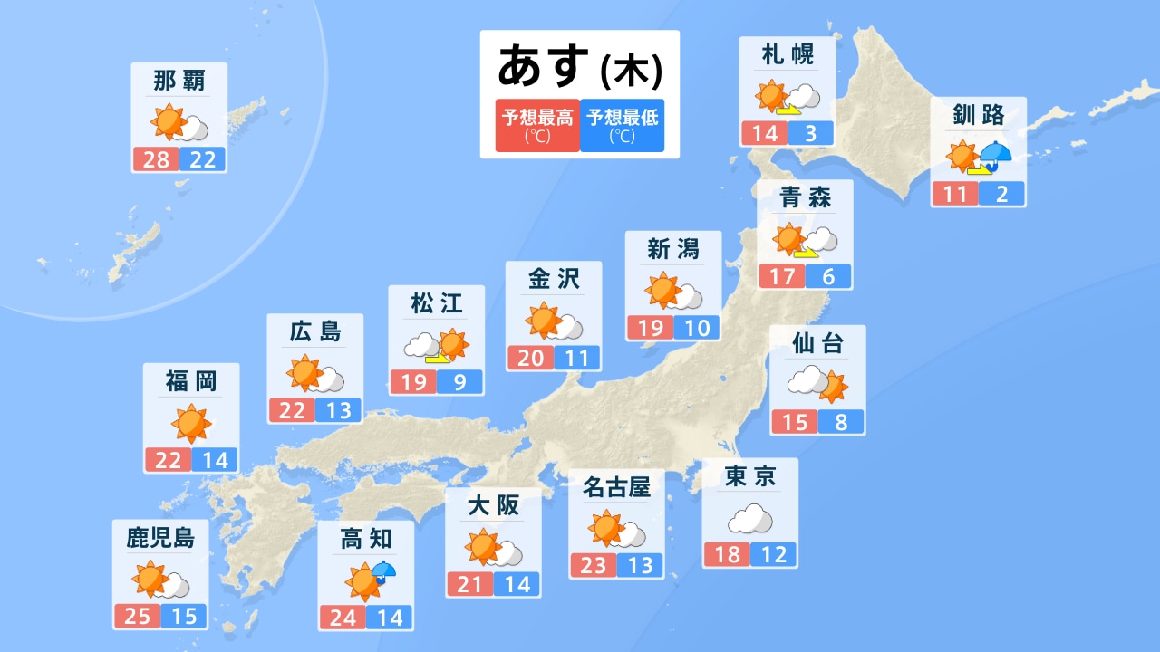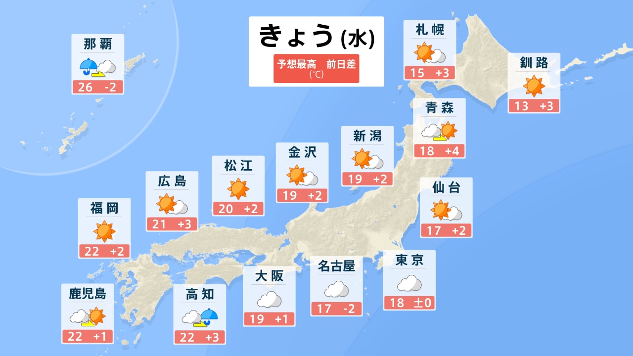 お天気ガイド 全国 11月5日(水)の天気 きょう あす ▼「各地のピンポイント天気」より検索してください▼ (※市区町村を選択するとより詳細なお天気情報を確認できます) 地域から選ぶ 北海道・東北 関東 中部・甲信越 近畿 中国・四国 九州・沖縄 都道府県から選ぶ 北海道 青森県 岩手県 宮城県 秋田県 山形県 福島県 茨城県 栃木県 群馬県 埼玉県 千葉県 神奈川県 東京都 新潟県 富山県 石川県 福井県 山梨県 長野県 岐阜県 静岡県 愛知県 三重県 滋賀県 京都府 大阪府 兵庫県 奈良県 和歌山県 鳥取県 島根県 岡山県 広島県 山口県 徳島県 香川県 愛媛県 高知県 福岡県 佐賀県 長崎県 熊本県 大分県 宮崎県 鹿児島県 沖縄県 市区町村から選ぶ 番組表 がっちりマンデー 毎週日曜あさ7:30~8:00に放送中の経済バラエティ「がっちりマンデー!!」がスゴ得にも登場!番組内容のアーカイブや「がっちりスクール」オリジナル記事など、読んで「お得な」情報も掲載! 「儲かりアワード2025夏!一番”すげえ”ビジネス」MC加藤浩次が放った「すげえ!」「マジで!」「なるほど!」「確かに!」のリアクションの数と大きさ・表情を計測し、特に反応が大きかった企業を厳選!一番大きく獲得したのは、どの儲かりビジネス? 次週…激動!ラーメンビジネス!𠮷野家がラーメン!?プロのラーメン学校!? サンデーモーニング 毎週日曜あさ8:00から放送中の情報番組「サンデーモーニング」がスゴ得にも登場!「手作りフリップ」コーナーの文字起こしで、時事ネタをより分かりやすく解説します! 手作りフリップ 【クマ被害で自衛隊派遣も】なぜ直接駆除せず?立ちはだかる“法的根拠”と“装備の検討” ご意見番スポーツ スポーツコーナー、スポーツご意見番「喝!あっぱれ!」のレギュラーご意見番は、上原浩治さん。上原さんと週替わりのゲストで、一週間のスポーツを幅広く取り上げます。プレーの数々に「喝!」「あっぱれ!」を入れながら、スポーツの感動を爽やかに伝えます! 喝!あっぱれ! 11月2日放送 プロ野球 日本シリーズサッカーウィンタースポーツラグビーMLB ワールドシリーズ コンテンツ スタンプ 呼んだっ?!(BooBo) しゅん(BooBo) 困った~(BooBo) 壁紙 田村真子 2022 山本恵里伽 2022 山形純菜 2022 しゃべマチ BooBo 烈子(アグレッシブ烈子) サウンド 効果音特集 歯の浮くセリフ特集 スポ着 着ネタ Twitter Facebook