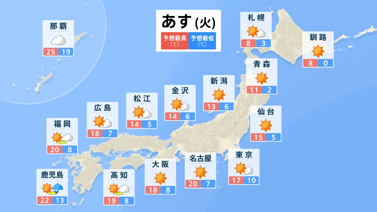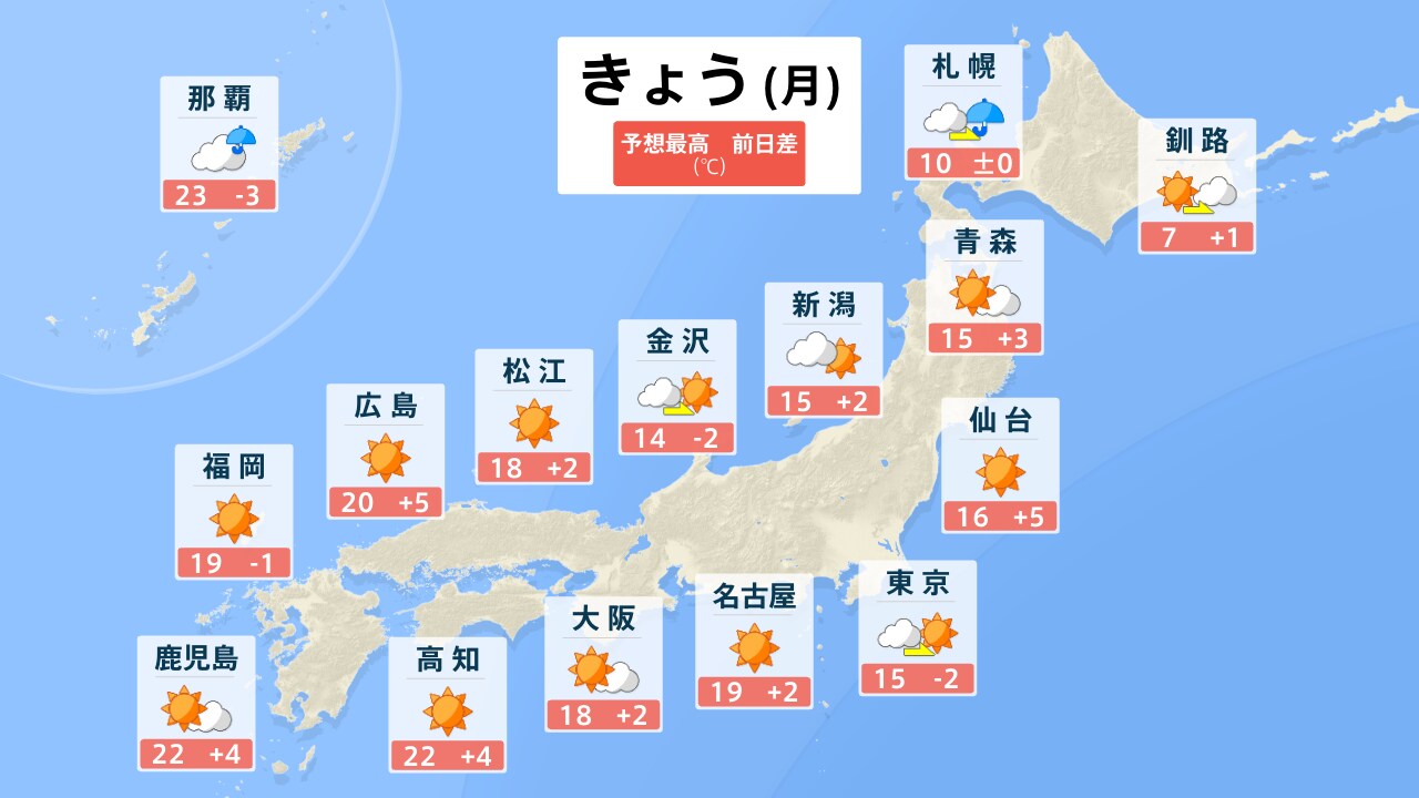 お天気ガイド 全国 3月23日(月)の天気 きょう あす ▼「各地のピンポイント天気」より検索してください▼ (※市区町村を選択するとより詳細なお天気情報を確認できます) 地域から選ぶ 北海道・東北 関東 中部・甲信越 近畿 中国・四国 九州・沖縄 都道府県から選ぶ 北海道 青森県 岩手県 宮城県 秋田県 山形県 福島県 茨城県 栃木県 群馬県 埼玉県 千葉県 神奈川県 東京都 新潟県 富山県 石川県 福井県 山梨県 長野県 岐阜県 静岡県 愛知県 三重県 滋賀県 京都府 大阪府 兵庫県 奈良県 和歌山県 鳥取県 島根県 岡山県 広島県 山口県 徳島県 香川県 愛媛県 高知県 福岡県 佐賀県 長崎県 熊本県 大分県 宮崎県 鹿児島県 沖縄県 市区町村から選ぶ 番組表 がっちりマンデー 毎週日曜あさ7:30~8:00に放送中の経済バラエティ「がっちりマンデー!!」がdバリューパスにも登場!番組内容のアーカイブや「がっちりスクール」オリジナル記事など、読んで「お得な」情報も掲載! 「儲かりアワード2025夏!一番”すげえ”ビジネス」MC加藤浩次が放った「すげえ!」「マジで!」「なるほど!」「確かに!」のリアクションの数と大きさ・表情を計測し、特に反応が大きかった企業を厳選!一番大きく獲得したのは、どの儲かりビジネス? 次回をお楽しみに! サンデーモーニング 毎週日曜あさ8:00から放送中の情報番組「サンデーモーニング」がdバリューパスにも登場!「手作りフリップ」コーナーの文字起こしで、時事ネタをより分かりやすく解説します! 手作りフリップ JR東日本が“約40年で初”値上げ 背景に赤字路線拡大など 特に首都圏で負担増 鉄道会社を選んで使えば節約も ご意見番スポーツ スポーツコーナー、スポーツご意見番「喝!あっぱれ!」のレギュラーご意見番は、上原浩治さん。上原さんと週替わりのゲストで、一週間のスポーツを幅広く取り上げます。プレーの数々に「喝!」「あっぱれ!」を入れながら、スポーツの感動を爽やかに伝えます! 喝!あっぱれ! 3月8日放送 WBC開幕戦国内女子ゴルフ東京マラソンパラリンピックMLBオープン戦 コンテンツ スタンプ 呼んだっ?!(BooBo) しゅん(BooBo) 困った~(BooBo) 壁紙 田村真子 2022 山本恵里伽 2022 山形純菜 2022 しゃべマチ BooBo 烈子(アグレッシブ烈子) サウンド 効果音特集 歯の浮くセリフ特集 スポ着 着ネタ Twitter Facebook