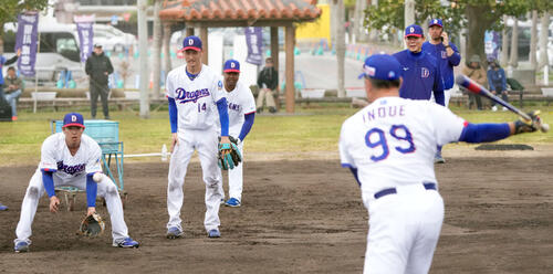【中日】ドラ1コンビ仲地礼亜&草加勝に井上監督「アゲアゲタイム」ノック、川崎コーチも見守る