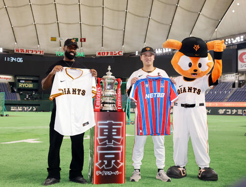 【巨人】東京ドームでFA杯トロフィー展示 岸田行倫が日本代表鎌田所属のパレスユニ受け取る