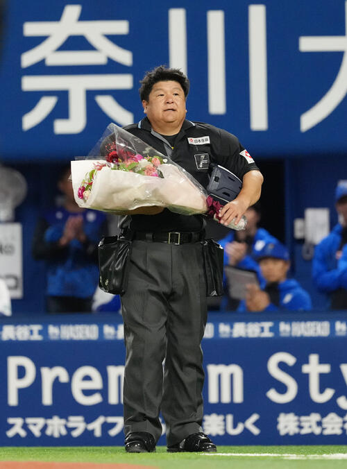 敷田直人審判員が2000試合出場達成 球場からの祝福に「卍ポーズ」で応える