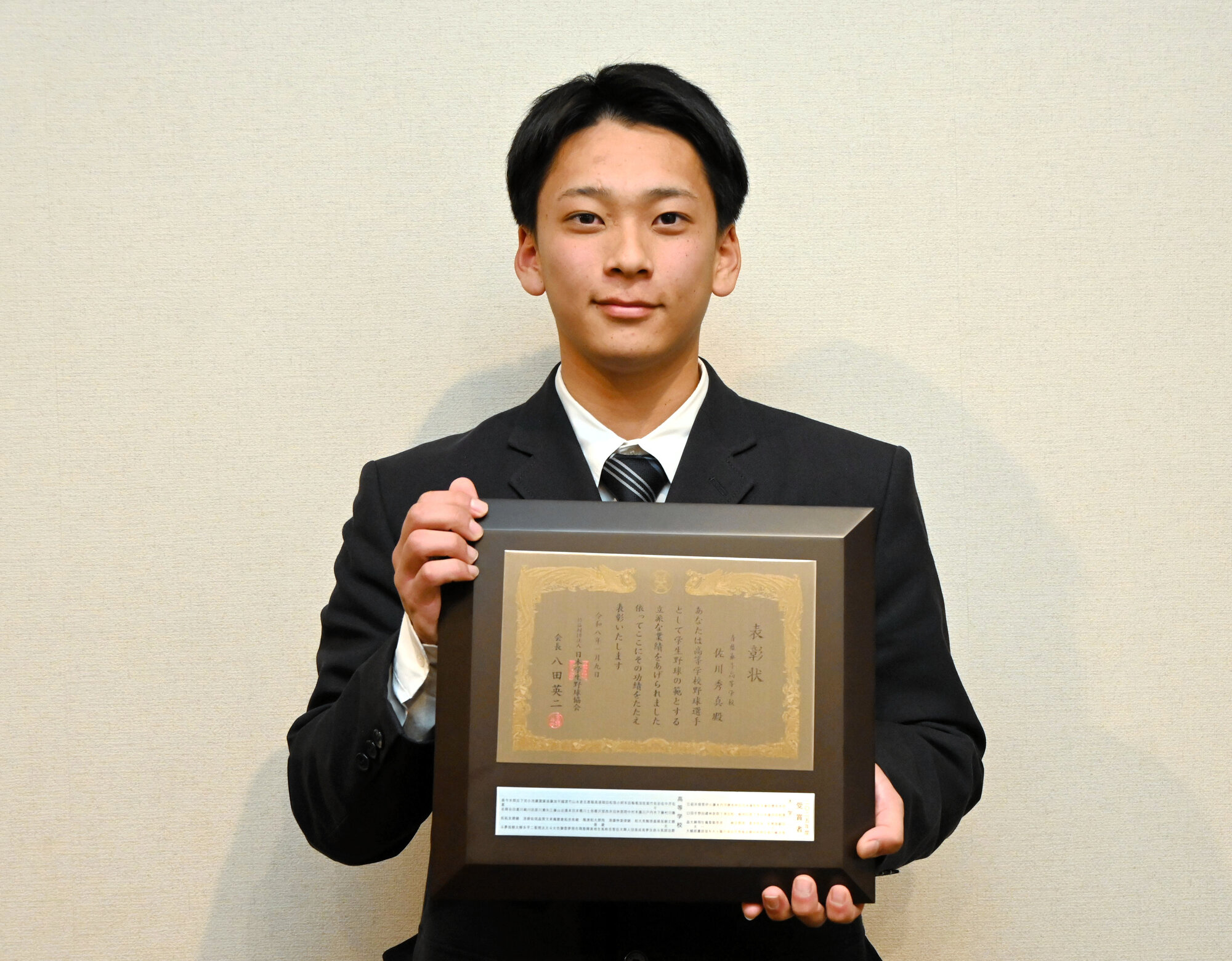 「全国一の遊撃手に」青藍泰斗の佐川選手、日本学生野球協会から表彰
