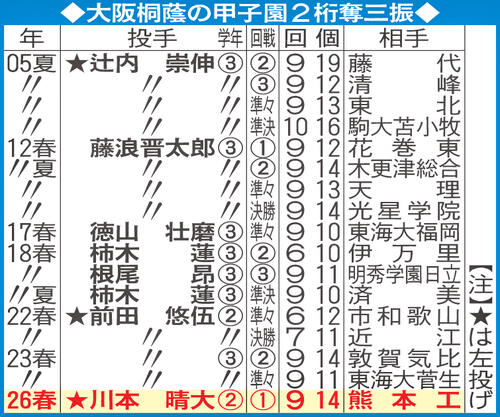 【センバツ】大阪桐蔭の甲子園2桁奪三振/一覧